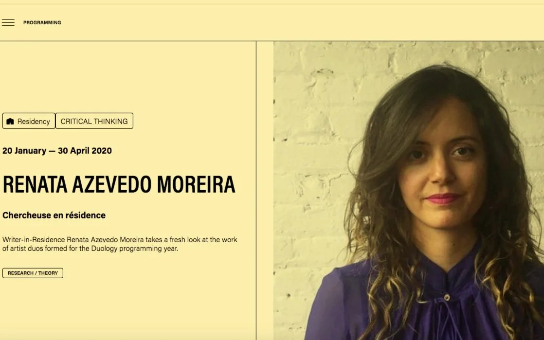 During the 2020 Duologies programming year at Dare-Dare, our resident Renata Azevedo Moreira brings a fresh perspective on the works each one of the duos is producing. This does not mean she will present to the audience the results of what they achieved during the year, but rather talk about the evolutionary development of their artworks.